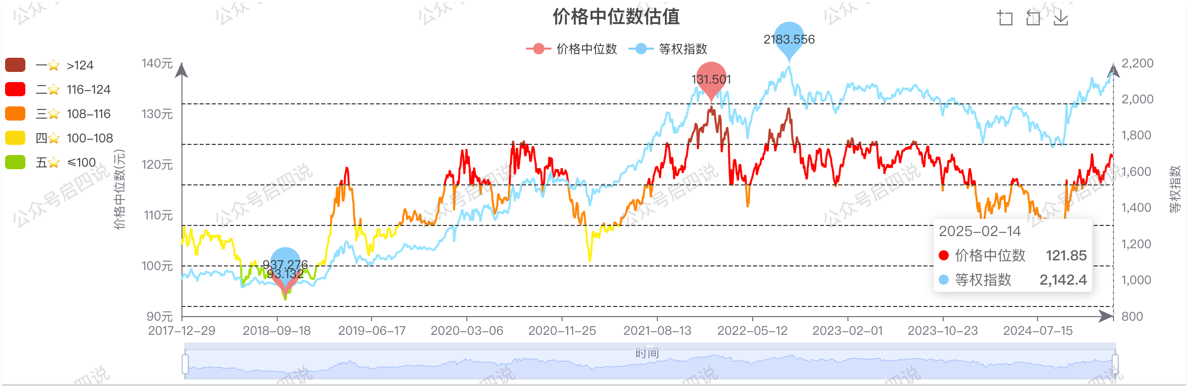 当前中位数: 121.85,当前相对上周上涨0.35元,位于二星级估值区