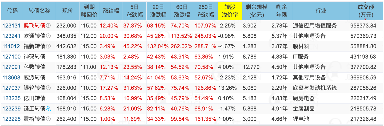银轮股份(10.00%)、科华数据(10.00%)、奥飞数据(19.98%)、威派格(9.96%)、福莱新材(9.42%)、奥飞转债(12.40%)、欧通转债(20.00%)、银轮转债(17.27%)