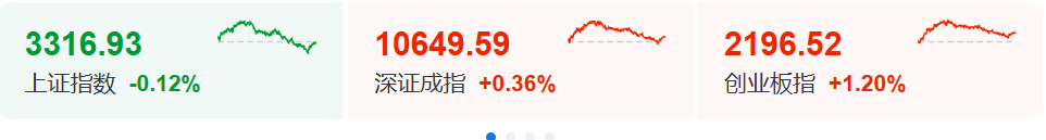 1、A股三大指数今日涨跌不一,截至收盘,沪指跌0.12%,深成指涨0.36%,创业板指涨1.20%,北证50指数涨2.27%。全市场成交额16643亿元,较上日缩量2412亿元。全市场超3200只个股上涨。