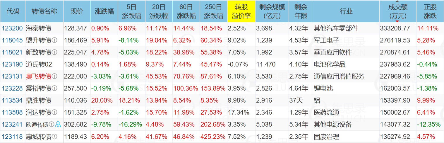 长青集团(-6.81%)、海泰科(14.11%)、湘油泵(-9.99%)、鼎胜转债(20.00%)