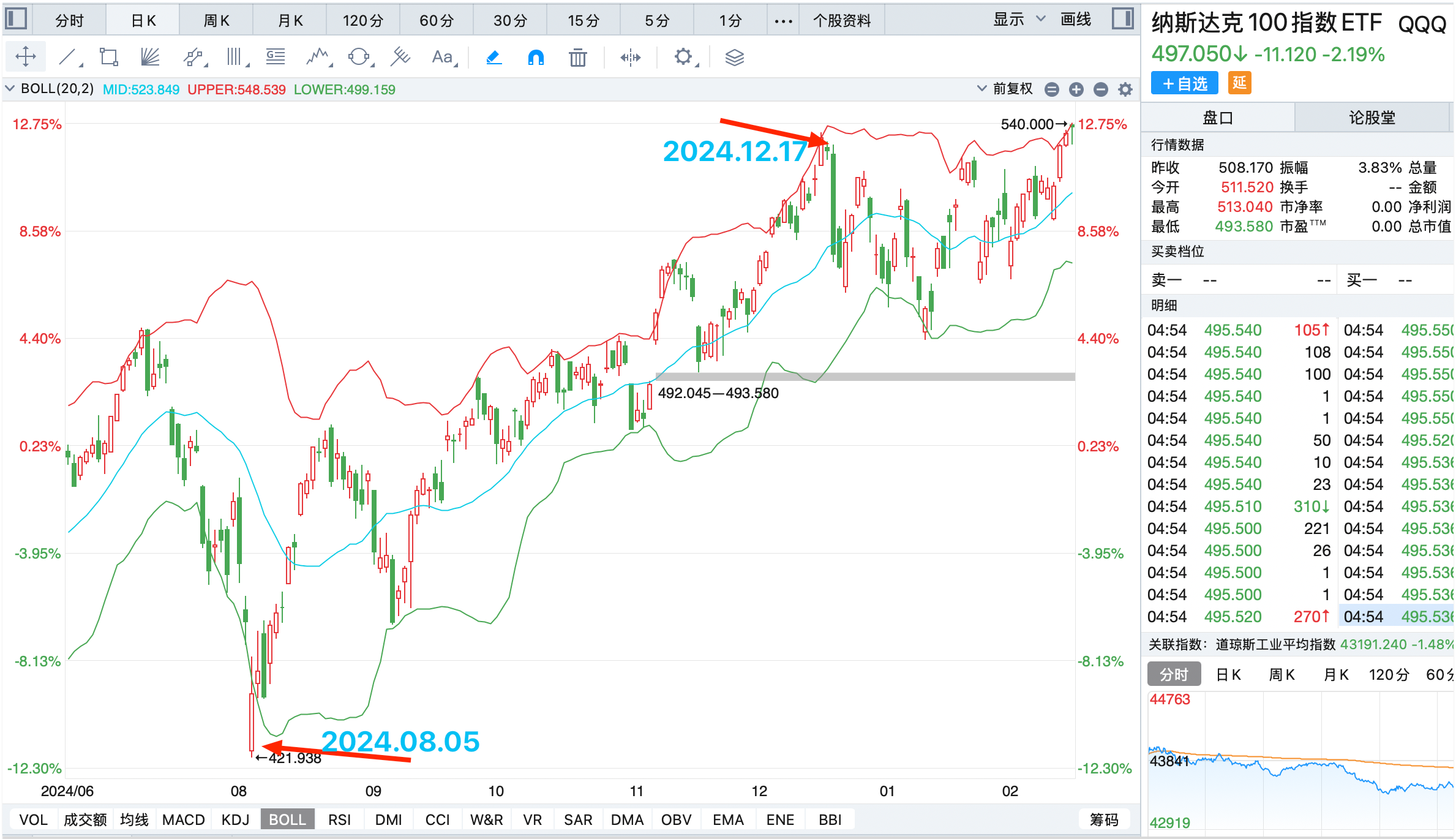 1)去年7-8月连续下跌期间,VIX指数从13逐渐涨到18,并不断升高,代表市场情绪逐渐恐慌,最终于2024.08.05达到峰值,当天最高65.73,收盘38.57。而当天就是纳指阶段最低点,后续迎来一波大反弹。