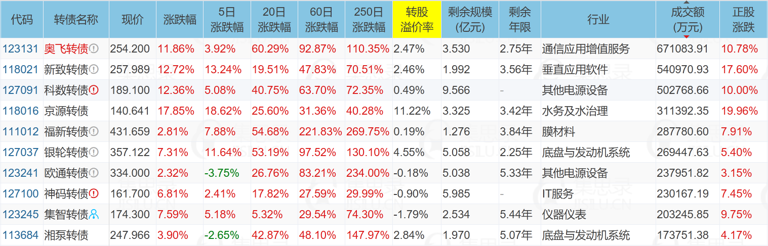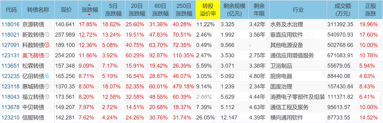 科华数据(10.00%)、ST中装(-5.13%)、神通科技(10.03%)、福莱新材(7.91%)、京源环保(19.96%)、新致软件(17.60%)、京源转债(17.85%)