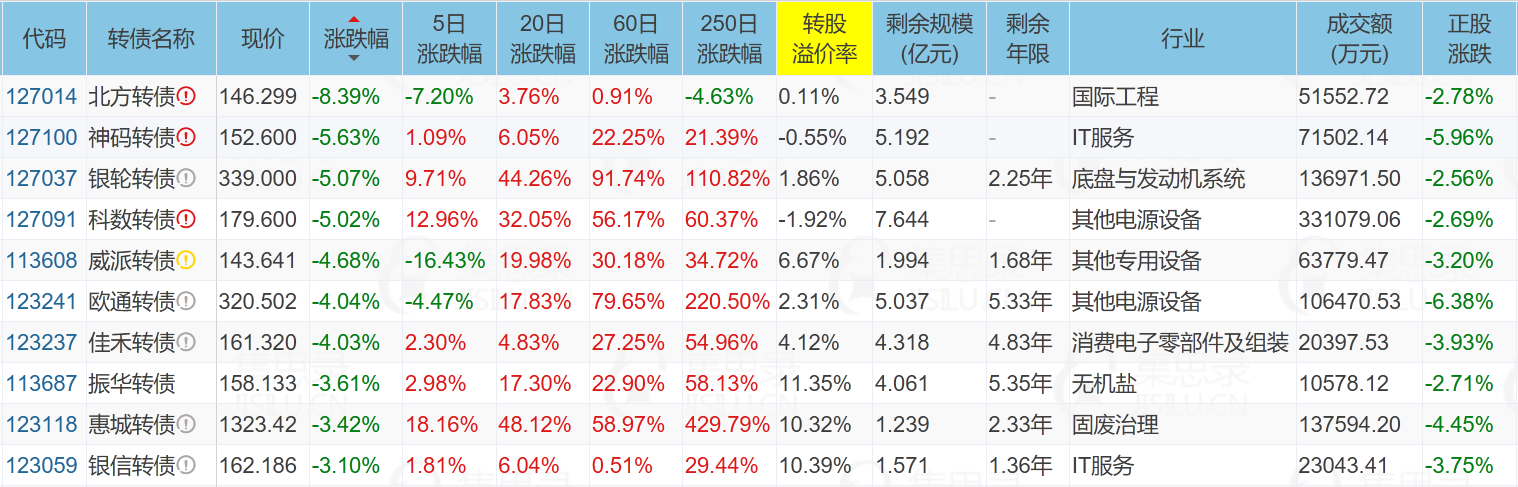至于博弈威派转债、北方转债不强赎的,就没那么好的运气了,直接跌幅榜安排,北方大跌8%,威派大跌5%(而且还没跌到底)。