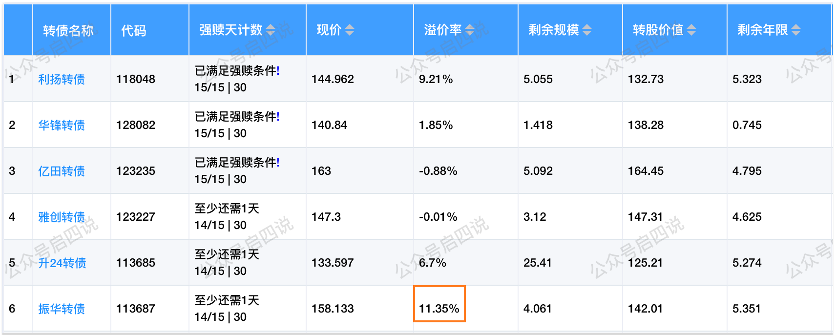 下周一振华转债将满足强赎条件,溢价率11.35%,一旦强赎又是一场腥风血雨。
