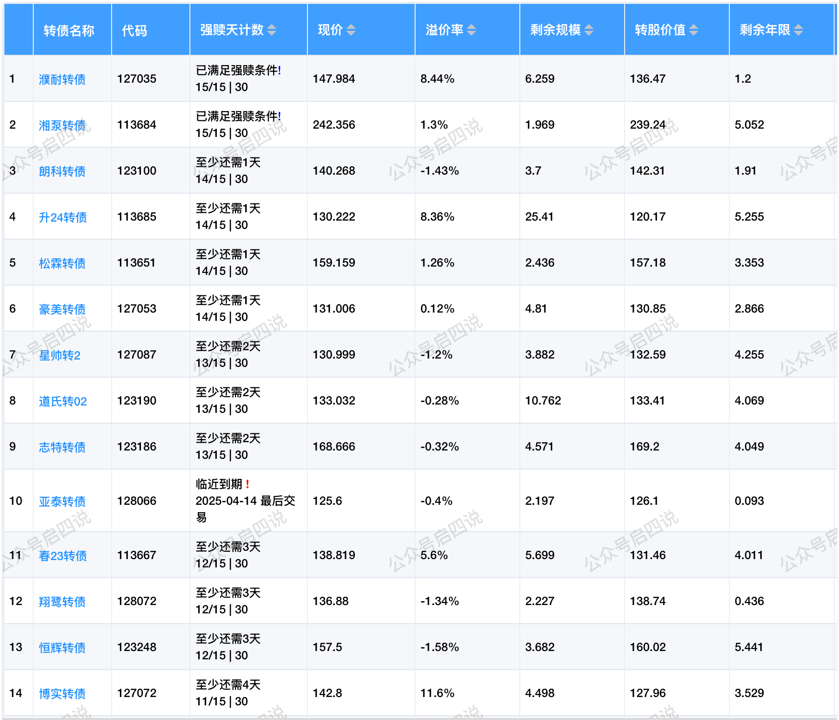 其中转股价值接近130元,且规模大于3亿或溢价率大于3%的转债,需要注意强赎后杀溢价的风险。