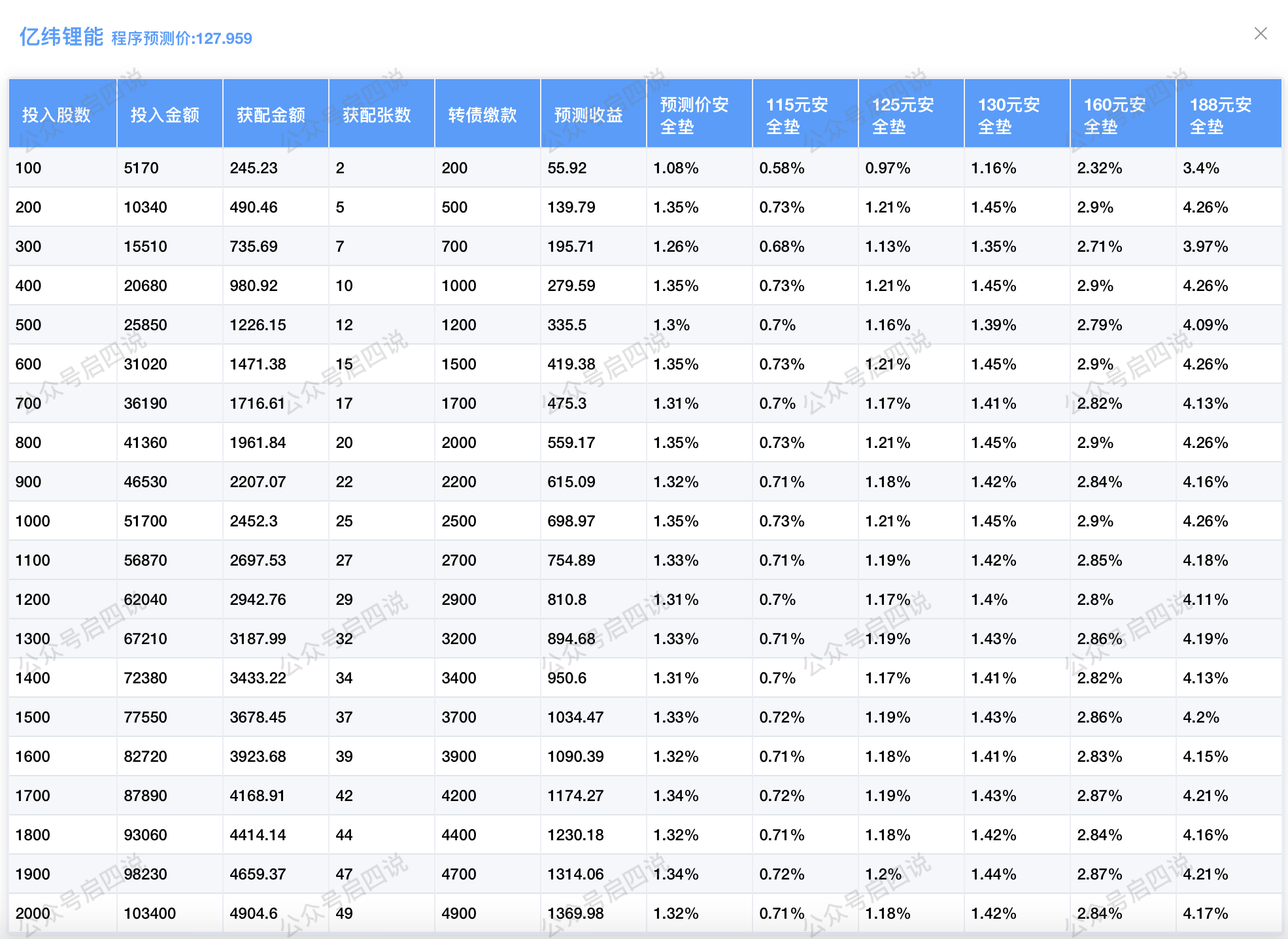程序预测上市价127.959元,启四预测上市价115元左右,配债所需股数和安全垫可以参考下图:
