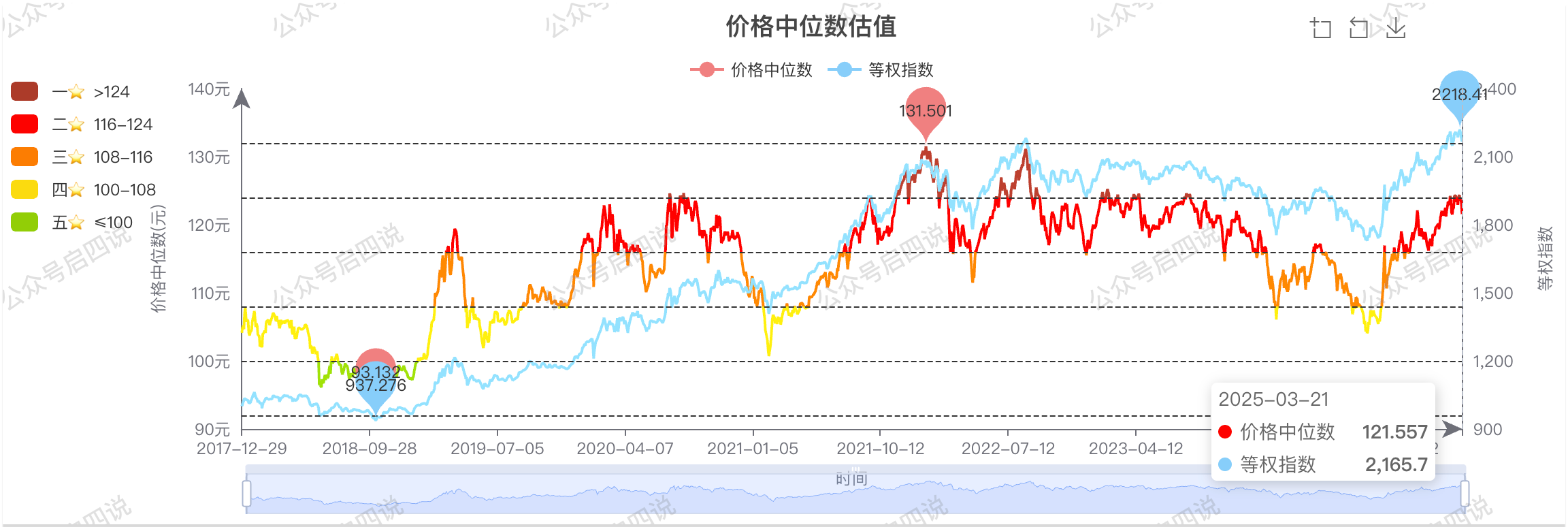 当前中位数:121.557,当前相对上周下跌2.443元,位于二星级估值区
