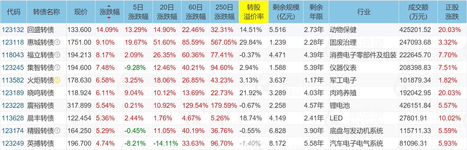 回盛生物(20.03%)、晓鸣股份(20.03%)、三房巷(10.23%)、永安行(-6.22%)
