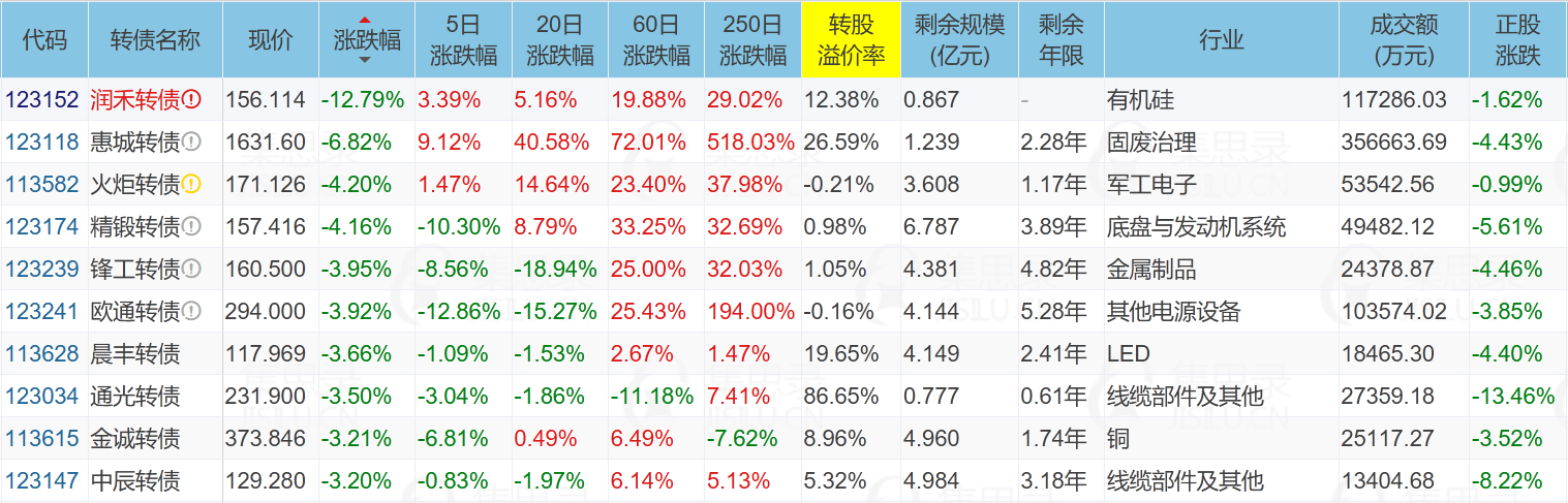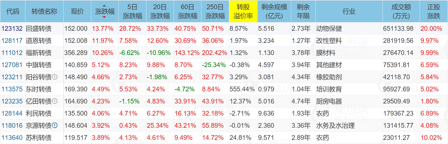 回盛生物(20.00%)、三房巷(9.79%)、泰瑞机器(-10.04%)、荣泰健康(9.99%)、苏利股份(10.02%)、回盛转债(13.77%)