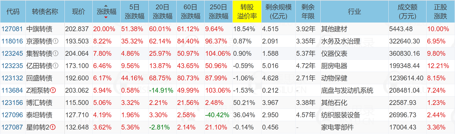 中旗新材(10.00%)、荣泰健康(-10.00%)、神通科技(10.04%)、中旗转债(20.00%)
