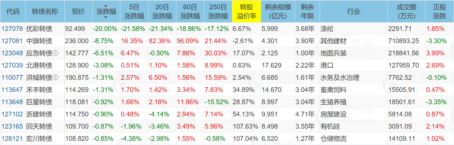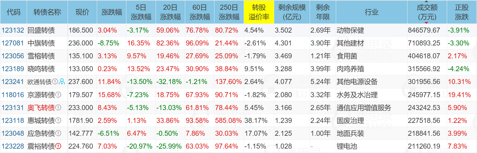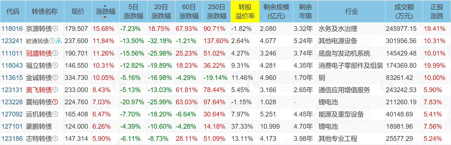 新乳业(10.00%)、京源环保(19.41%)、福立旺(19.99%)、京源转债(15.68%)、优彩转债(-20.00%)