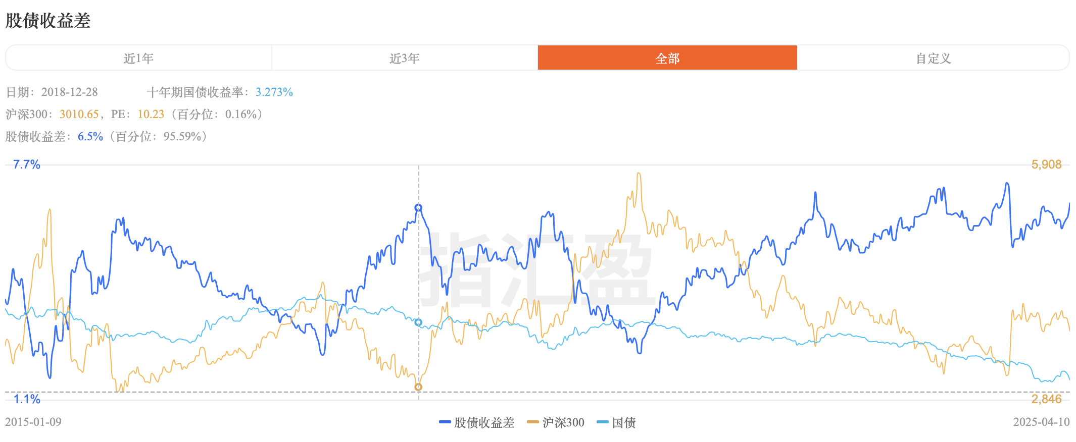 2018-12-28,股债收益差百分位95.59%,沪深300触及底部,随后开始一轮轰轰烈烈长达4个多月的上涨,涨幅近43%,爽翻。