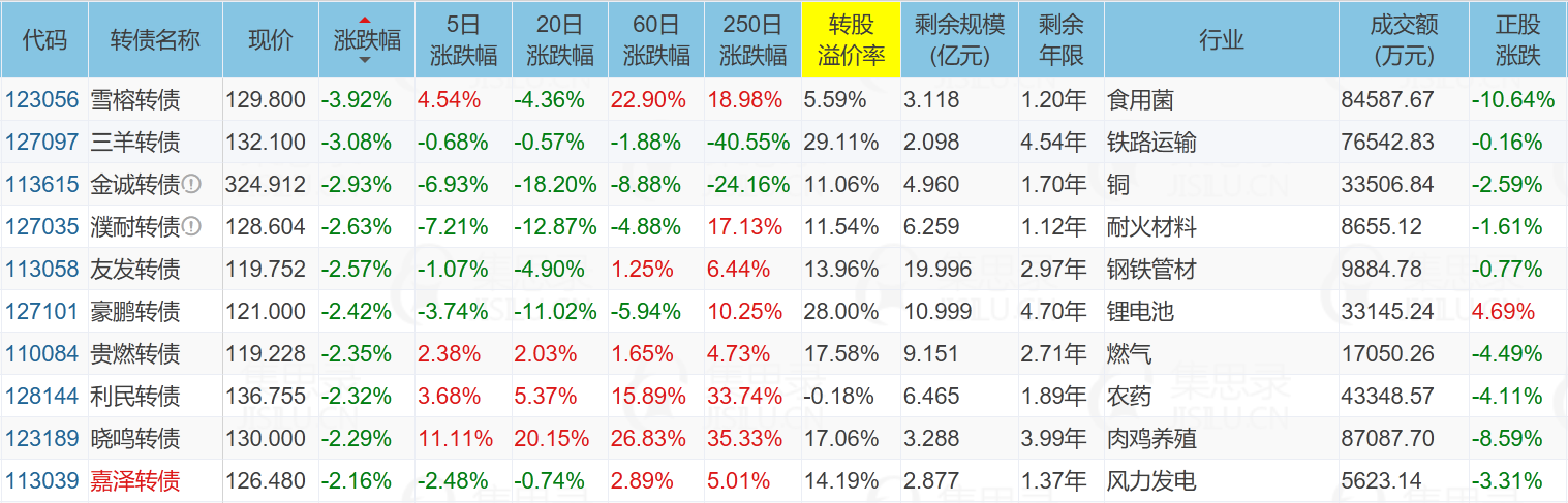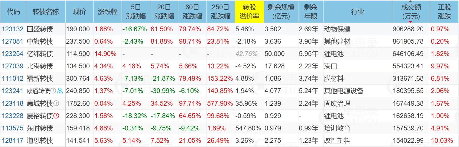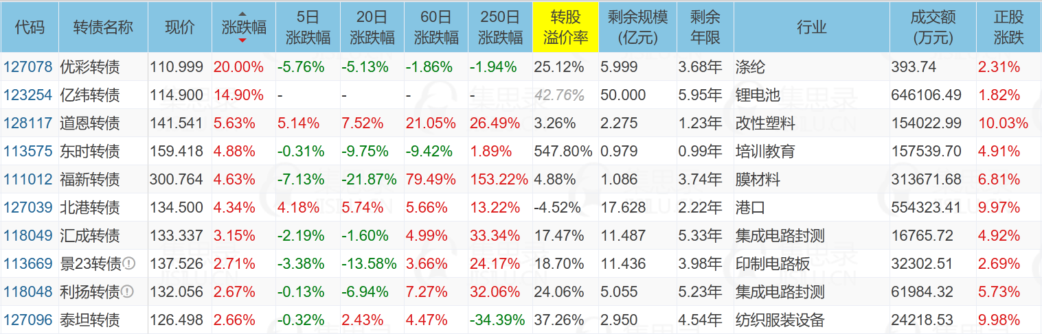 北部湾港(9.97%)、亿纬转债(14.90%)、优彩转债(20.00%)