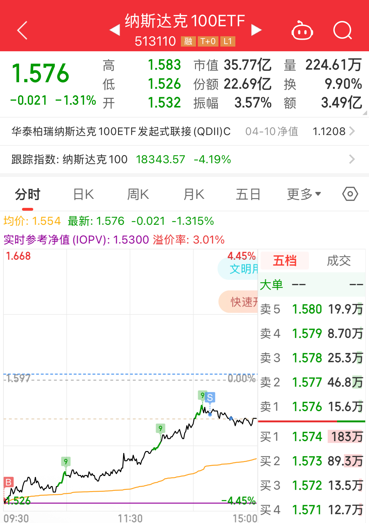 早盘在溢价率比较低的几只纳指ETF中挑了1只,走势正如剧本预料的那样,还不错。