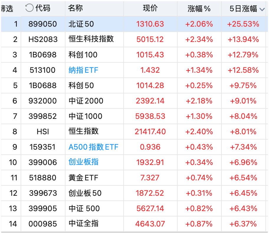 但小票这波真的猛。北证50过去5天直接干了25%的反弹,科创50、中证1000、中证2000也都涨超9%。结构上看,活跃资金还是在搏短线机会。这也启发我们:下次大跌时,多关注跌得最猛的。
