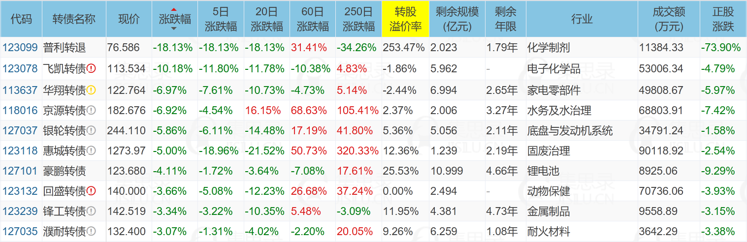 红墙股份(-3.11%)、九洲集团(-4.10%)、普利退(-73.90%)、珀莱雅(10.00%)、普利转退(-18.13%)