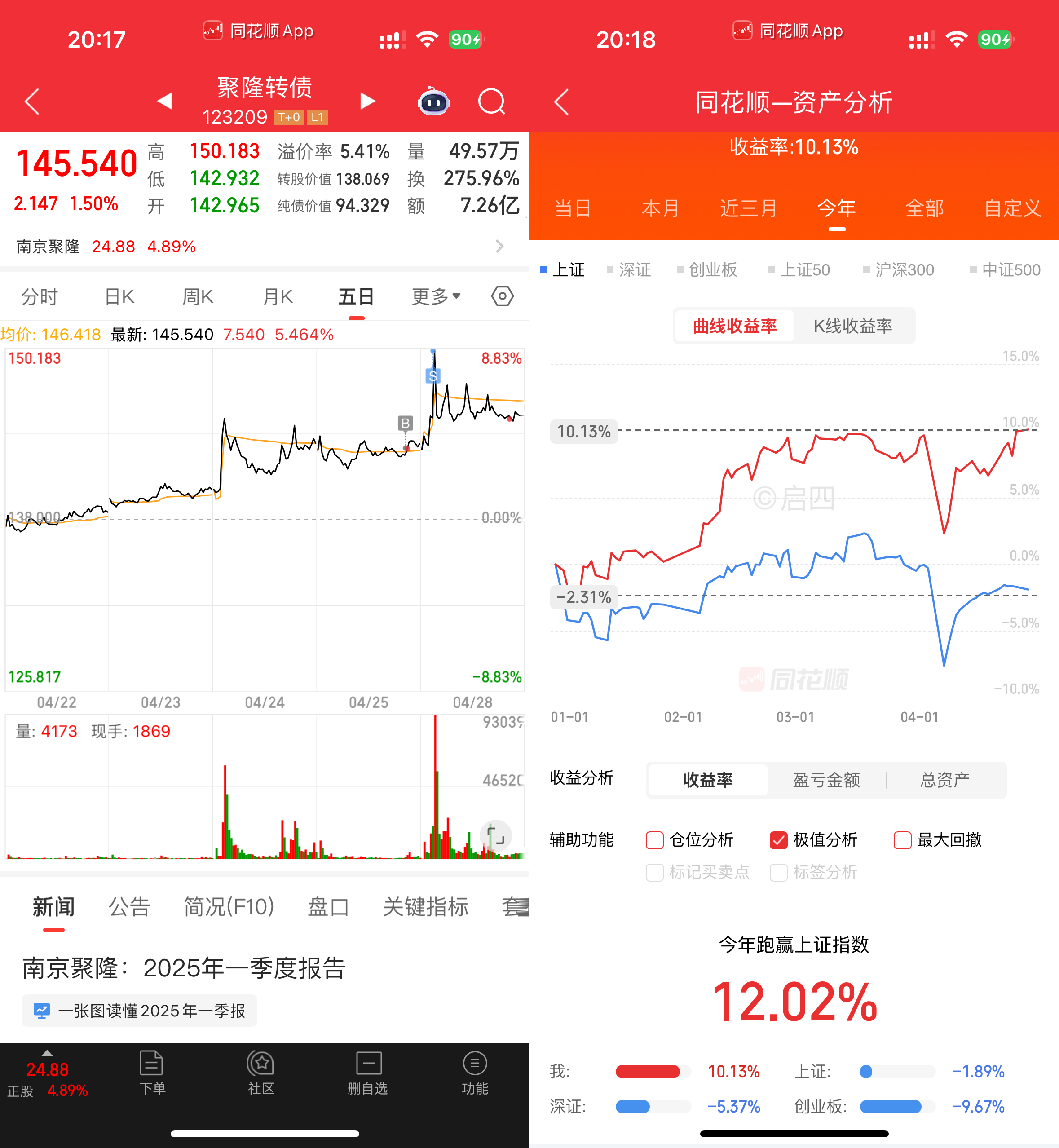 倒是转债,今天又钓到一只——上周刚调仓买入的聚隆转债,今天吃肉了。