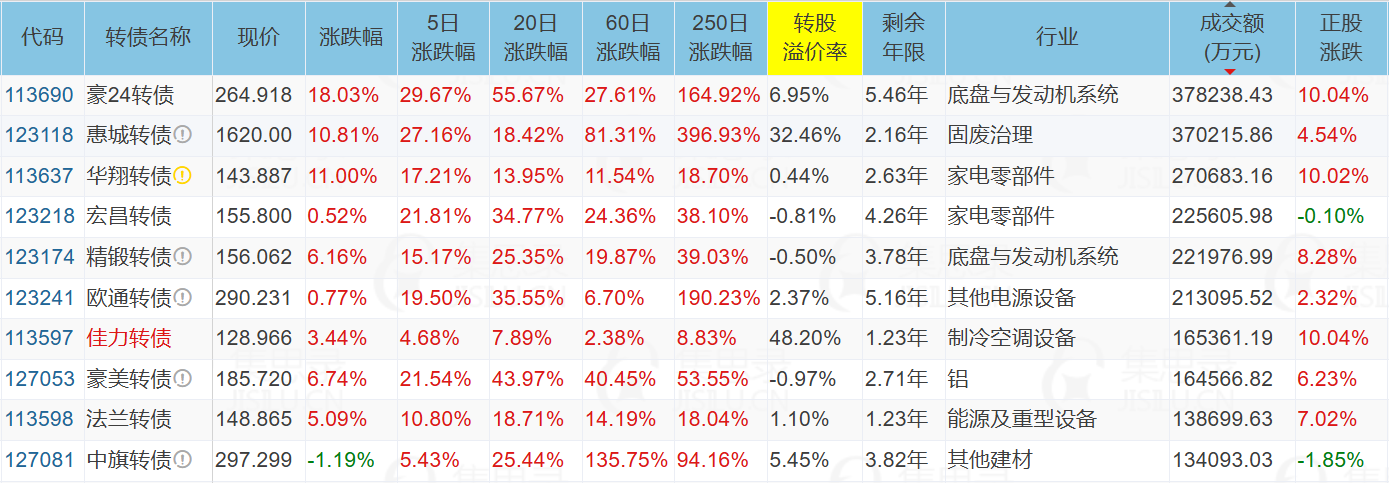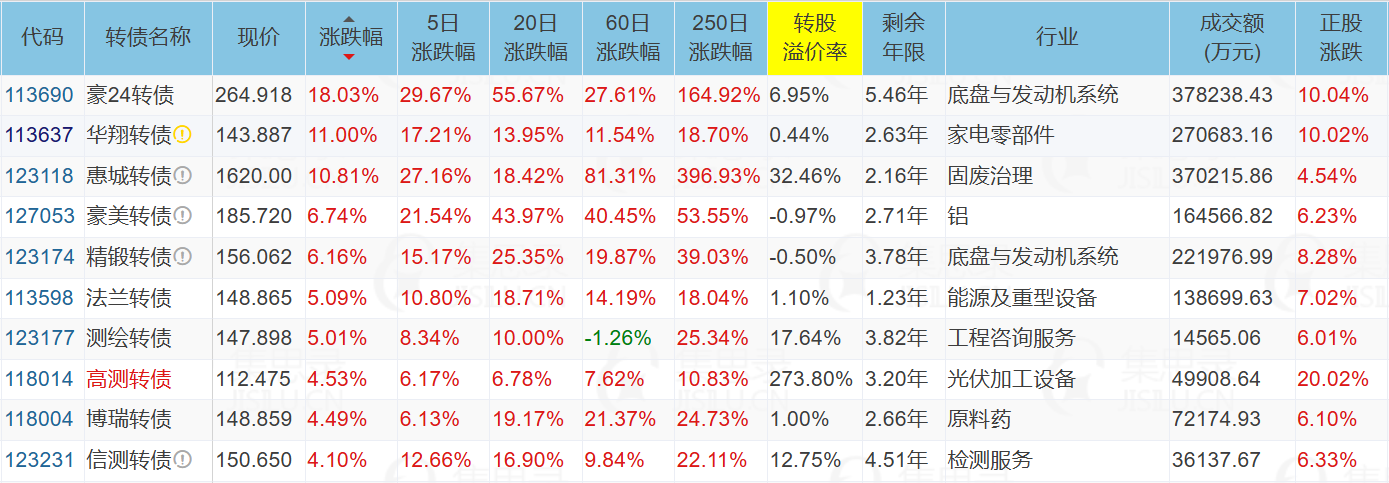 代表债:侨银转债、豪24转债、华翔转债、章鼓转债、高测转债、精锻转债、法兰转债、测绘转债
