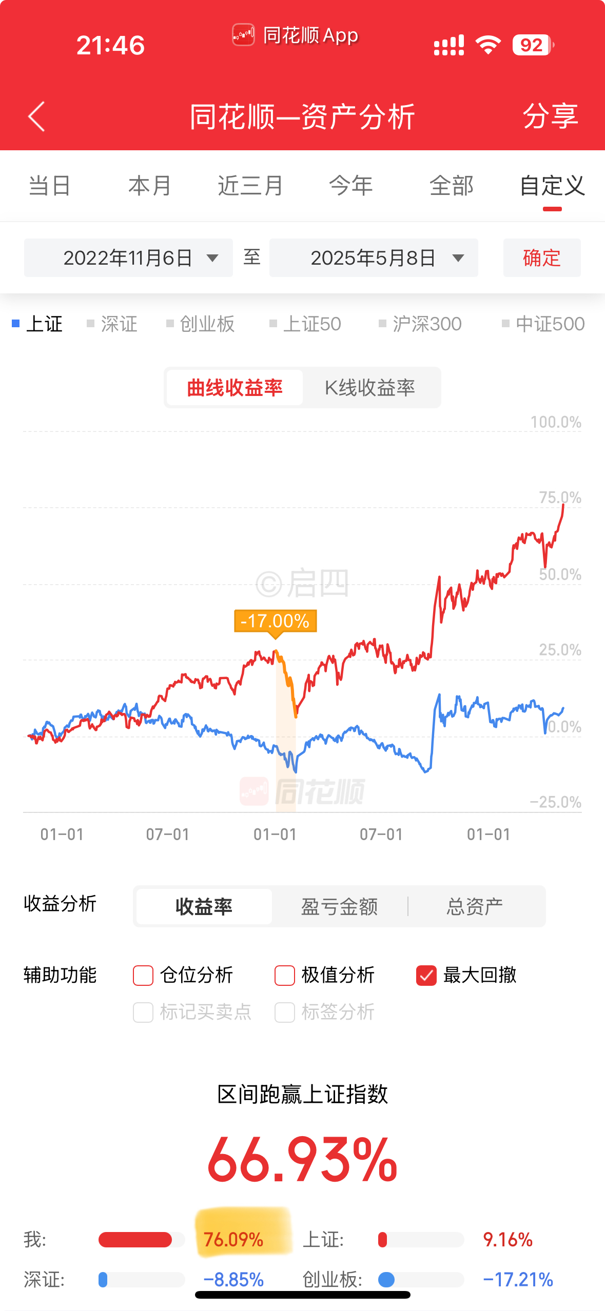策略从2022年11月7日开始运行,现在刚好30个月,总收益76.09%,最大回撤17%。远远跑赢上证、深证、创业板指数。
