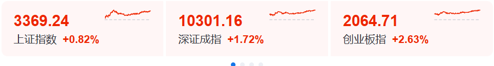 A股三大指数今日集体上涨,截至收盘,沪指涨0.82%,深成指涨1.72%,创业板指涨2.63%,北证50指数涨2.89%。全市场成交额13409亿元,较上日放量1185亿元。全市场超4100只个股上涨。