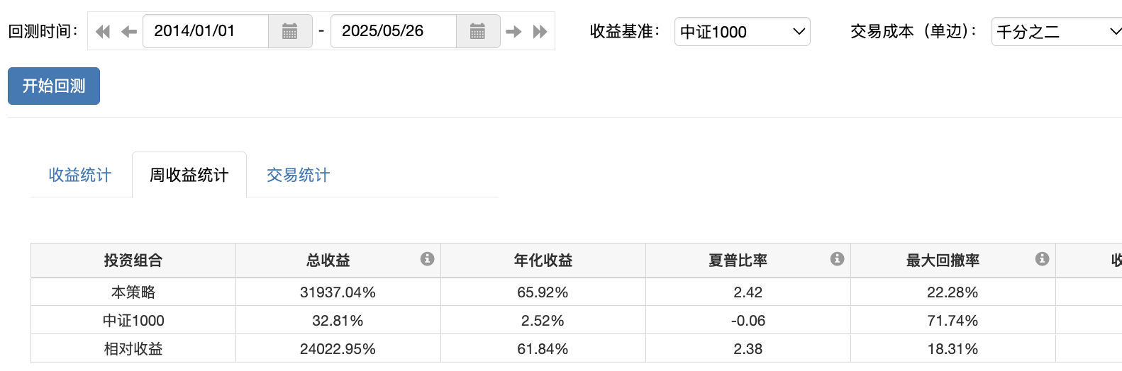 从2014/01/01到2025/05/26,总收益31937%,差不多翻了接近320倍,年化收益可以达到65.92%,最大回撤可以控制到22.28%。这个收益和回撤我已经非常满意了,打算找机会开始实盘。