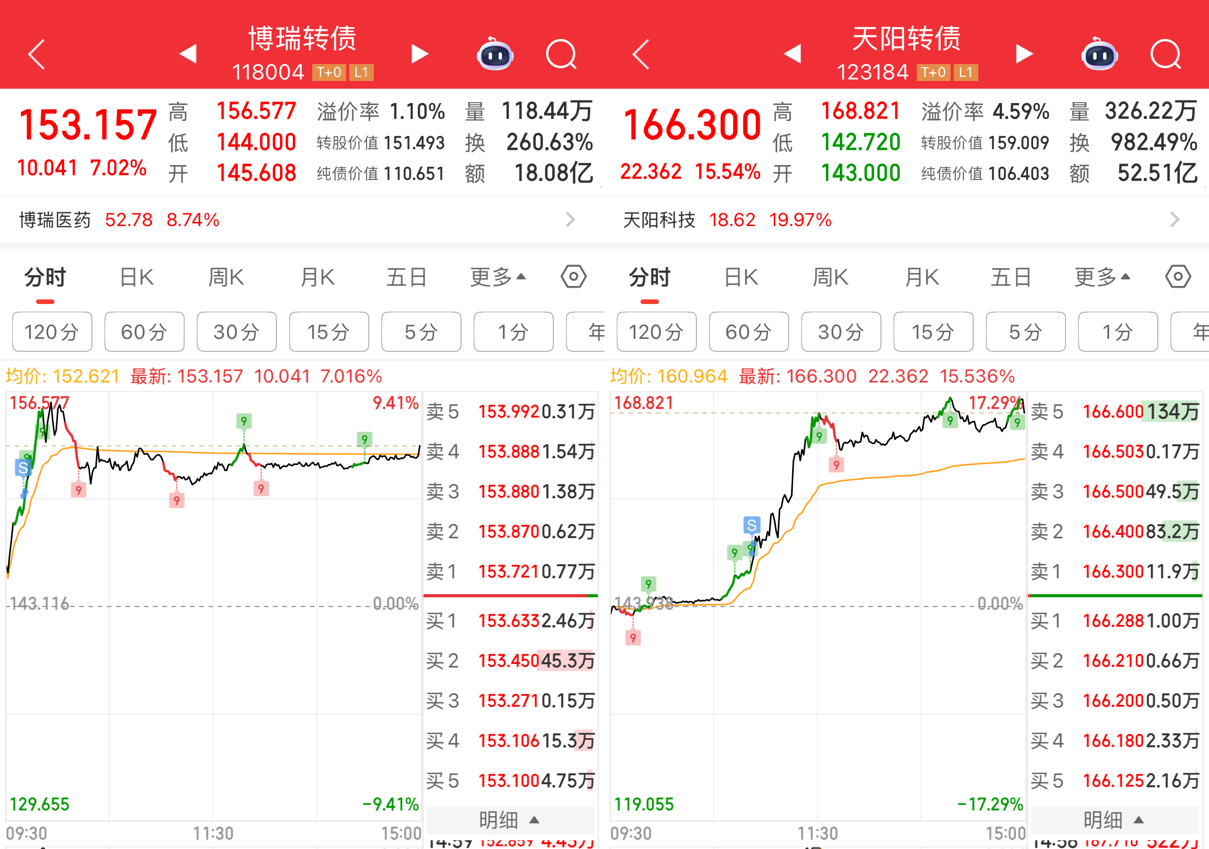今天再次吃到双响炮——博瑞转债、天阳转债,不过前者卖飞了,后者更是大卖飞,只能劝自己卖飞是福吧。
