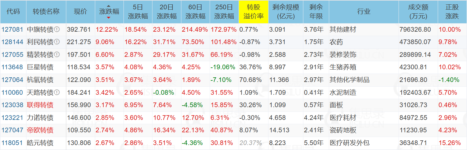 中旗新材(10.00%)、侨银股份(-9.73%)、天阳科技(4.73%)、皓元医药(15.26%)