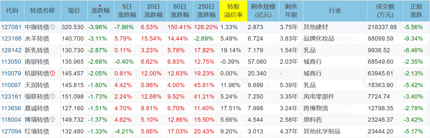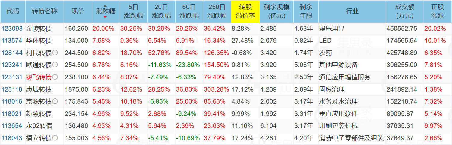 中旗新材(-5.56%)、金陵体育(20.02%)、汇通集团(10.10%)、苏利股份(10.03%)、金陵转债(20.00%)