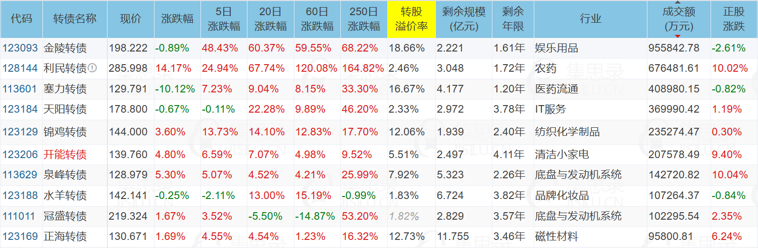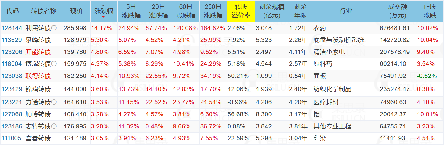 **利民股份/利民转债:**国内最大的杀菌剂生产企业之一,主营产品包括农用杀菌剂、杀虫剂、除草剂。上涨是业绩反转、技术护城河、政·策红利、资金共振四重逻辑叠加的结果。