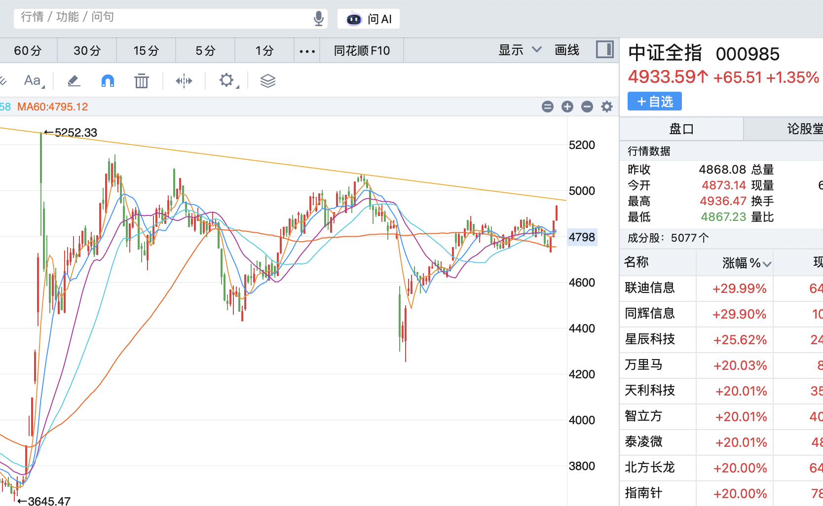 从技术面上看,昨天上证刚突破反压线,今天中证全指也顶上来了,距离突破一步之遥。如果明天还能放量突破,那就继续嗨,否则就大概率要回调一波,等三四季度再重新上冲。反正我的预期是今年上证指数涨幅超过10%。