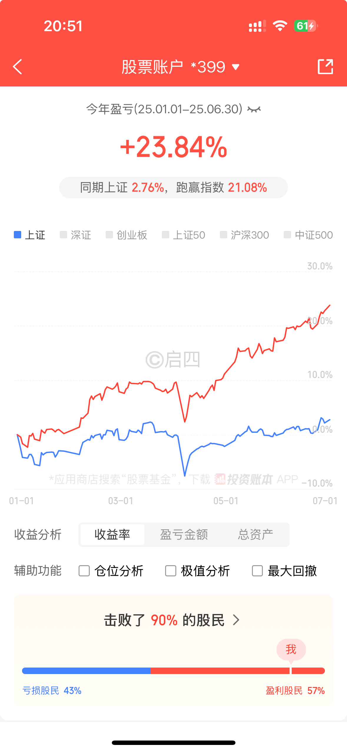 最后总结一下上半年成绩:截至今日,本月收益+5.81%,今年收益+23.84%。同期上证指数涨幅2.76%,跑赢指数21.08%,同花顺投资账本显示击败了90%的股民。下半年继续朝着三年翻倍的目标进发!