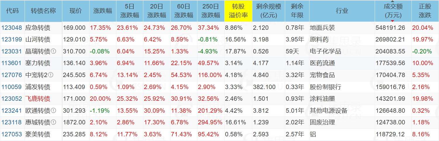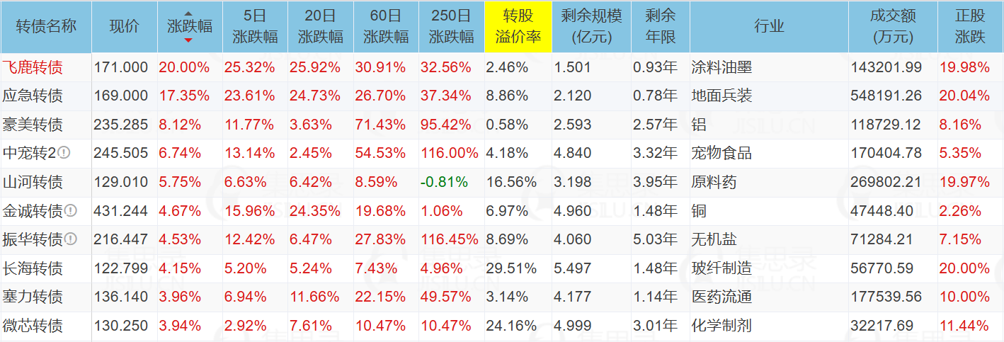 长海股份(20.00%)、山河药辅(19.97%)、中船应急(20.04%)、应急转债(17.35%)、飞鹿转债(20.00%)