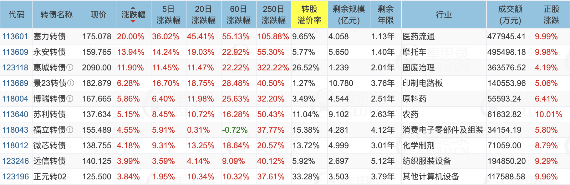 红墙股份(-6.18%)、美诺华(10.01%)、微芯生物(8.79%)、塞力转债(20.00%)