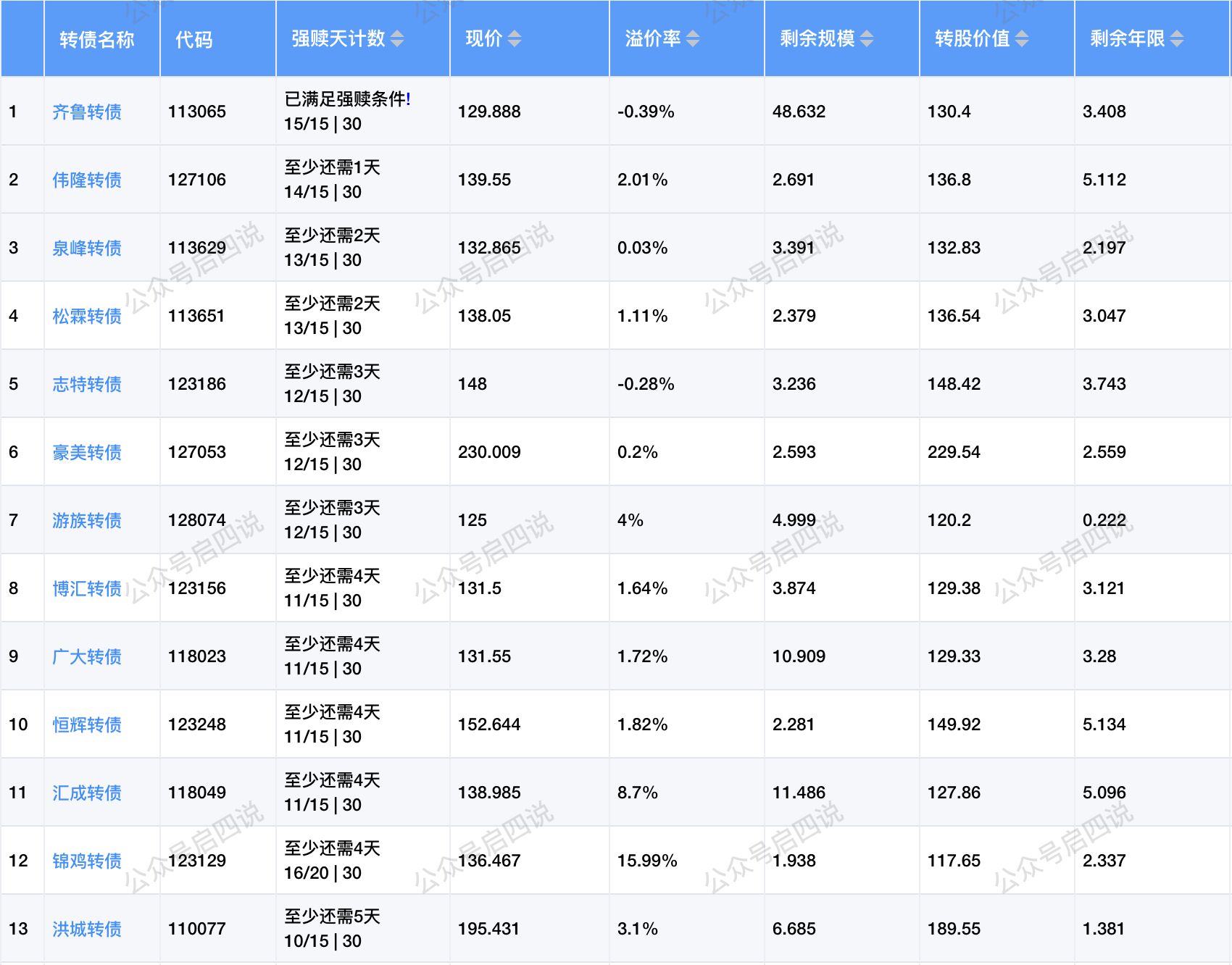 齐鲁转债,周末公告了强赎。现价129.888,溢价率-0.39%,无杀溢价空间,后面债随股走。