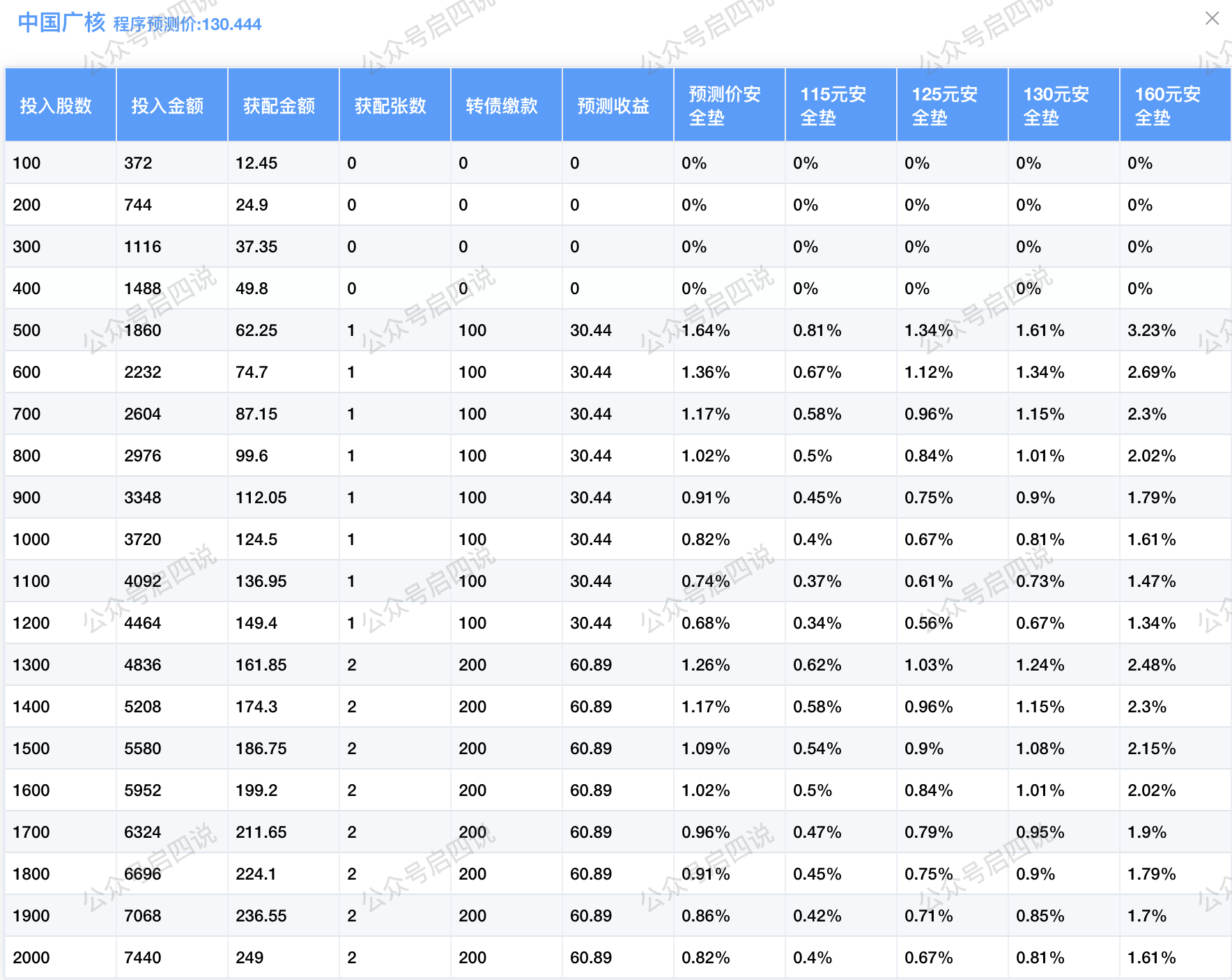 程序预测上市价130.444元,配债所需股数和安全垫可以参考下图: