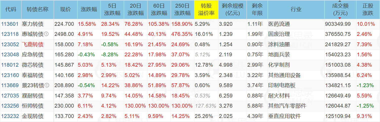 美锦能源(9.91%)、晶澳科技(9.96%)、重庆建工(10.12%)、塞力医疗(10.01%)、山东玻纤(10.02%)、新中港(-10.04%)、宏柏新材(10.03%)、塞力转债(15.58%)、N华辰转(57.30%)、N路维转(34.74%)