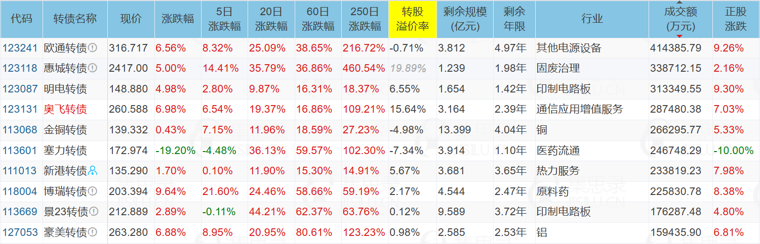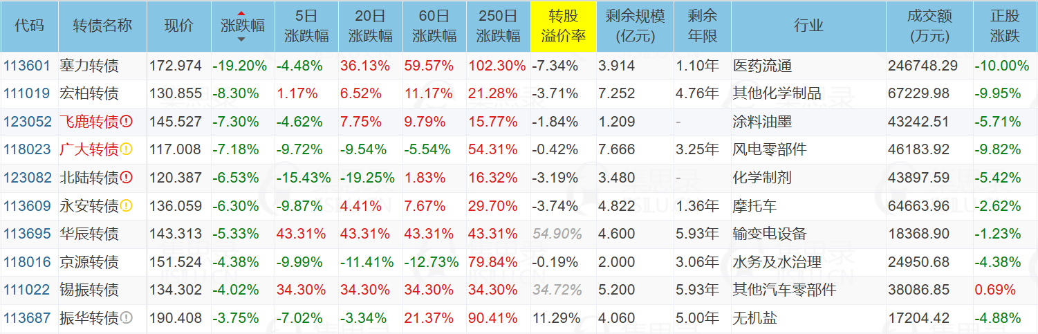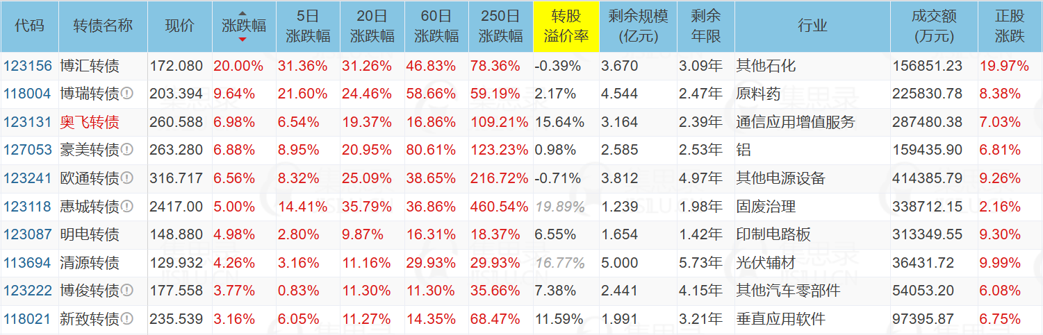 博汇股份(19.97%)、汇通集团(10.08%)、科沃斯(10.00%)、洛凯股份(-6.70%)、塞力转债(-19.20%)、博汇转债(20.00%)