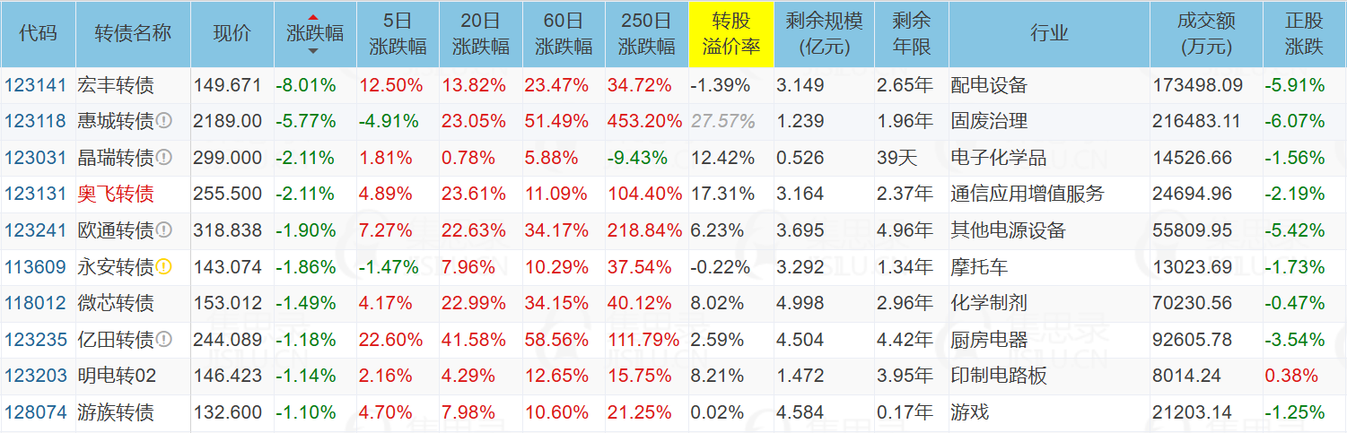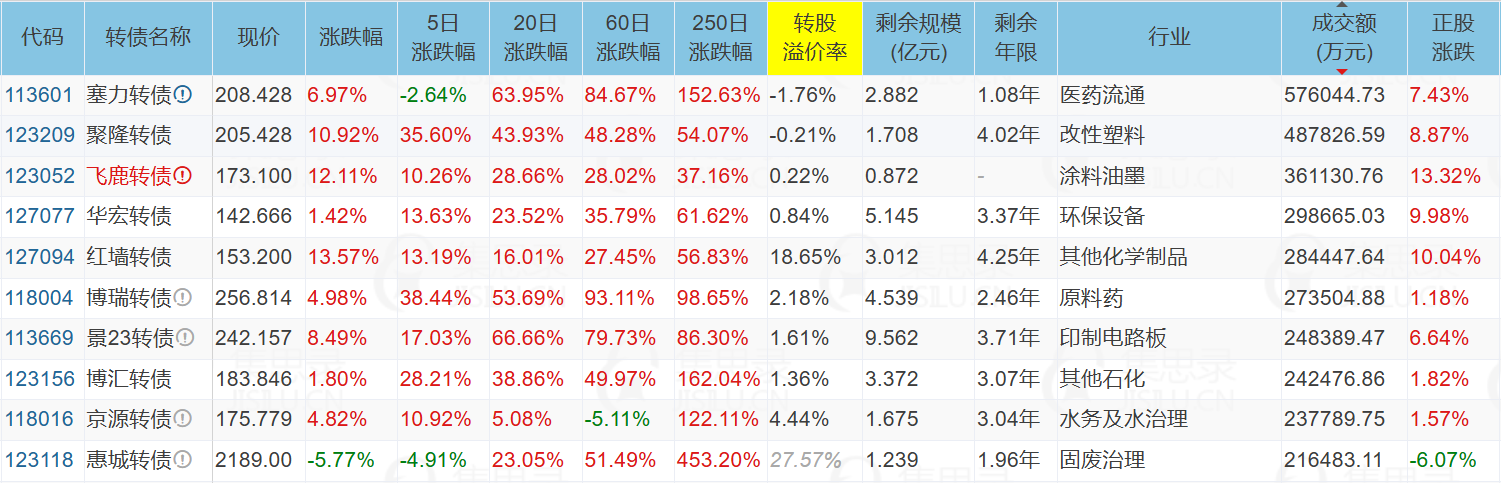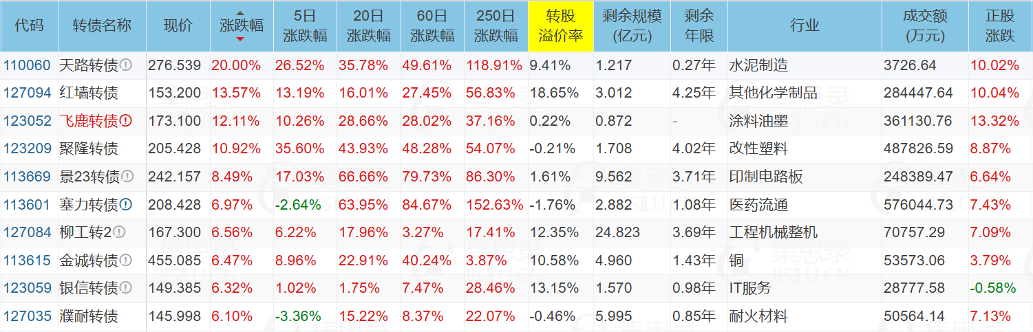 华宏科技(9.98%)、飞鹿股份(13.32%)、重庆建工(10.14%)、塞力医疗(7.43%)、苏博特(10.05%)、天路转债(20.00%)、聚隆转债(10.92%)