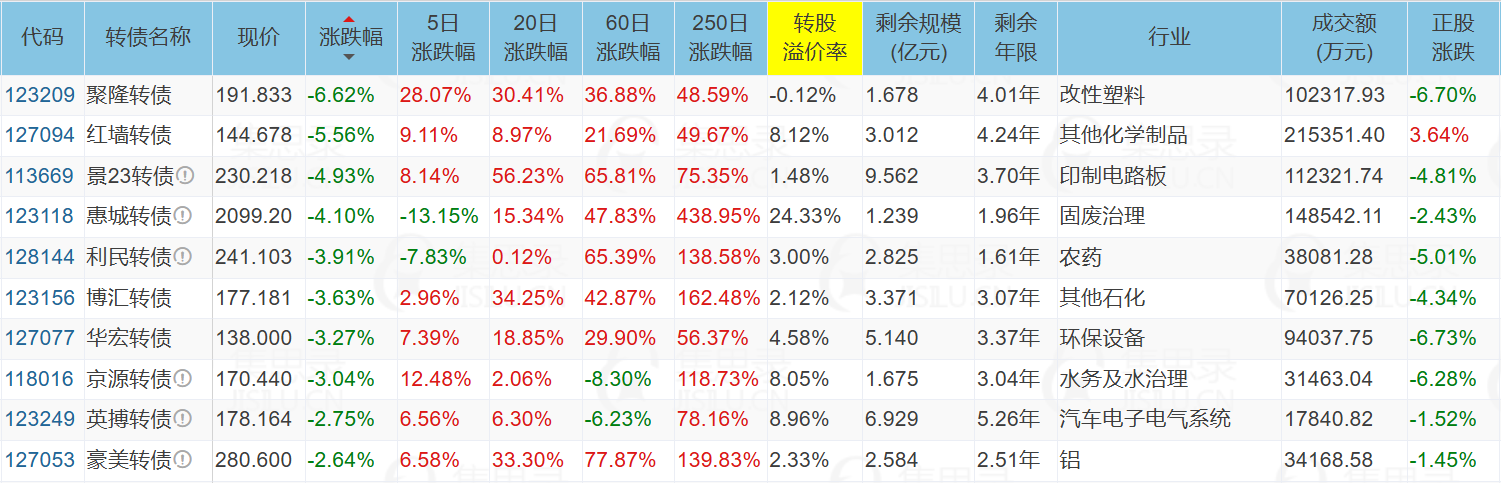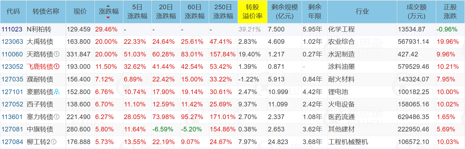 柳工(10.03%)、华宏科技(-6.73%)、红墙股份(3.63%)、大禹节水(19.96%)、飞鹿股份(10.21%)、天路转债(20.00%)、N利柏转(29.46%)、大禹转债(20.00%)