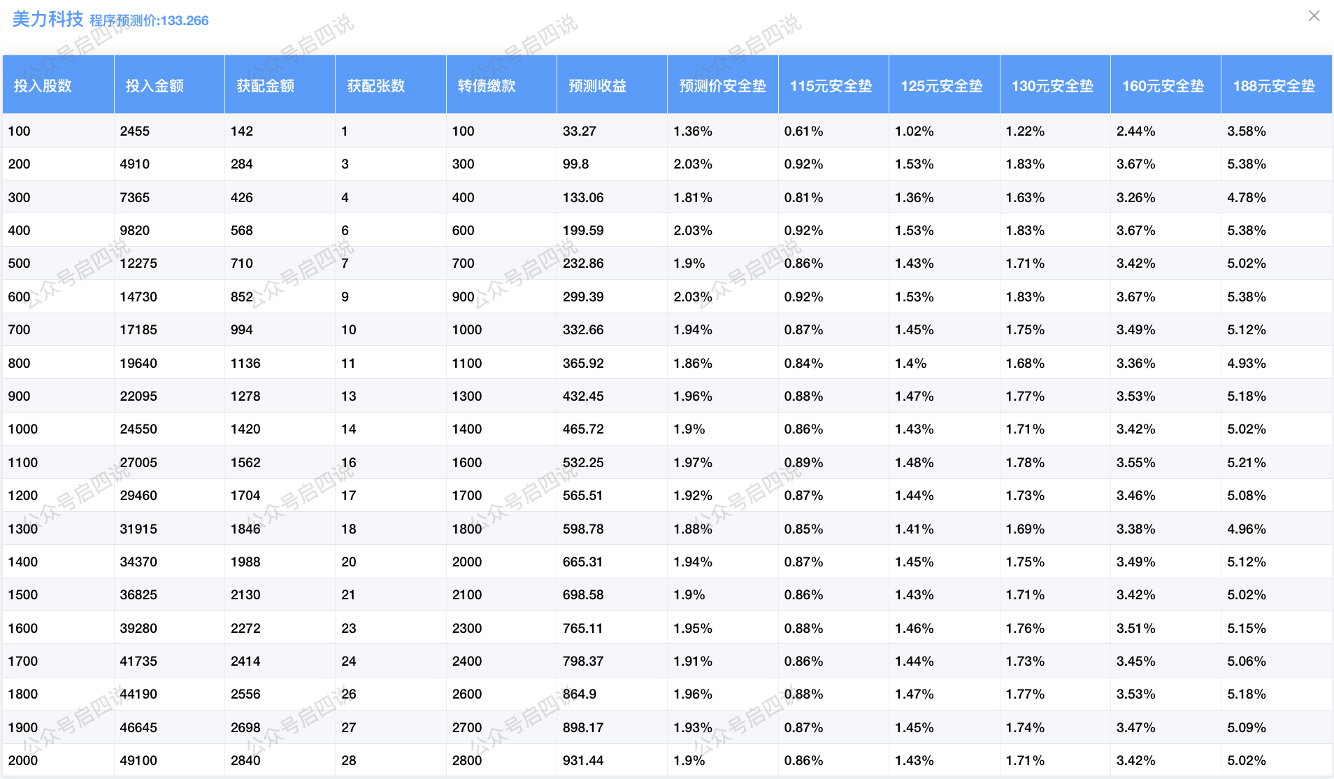 程序预测上市价133.266元,配债所需股数和安全垫可以参考下图: