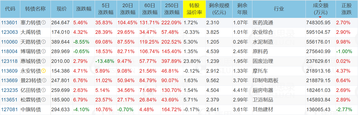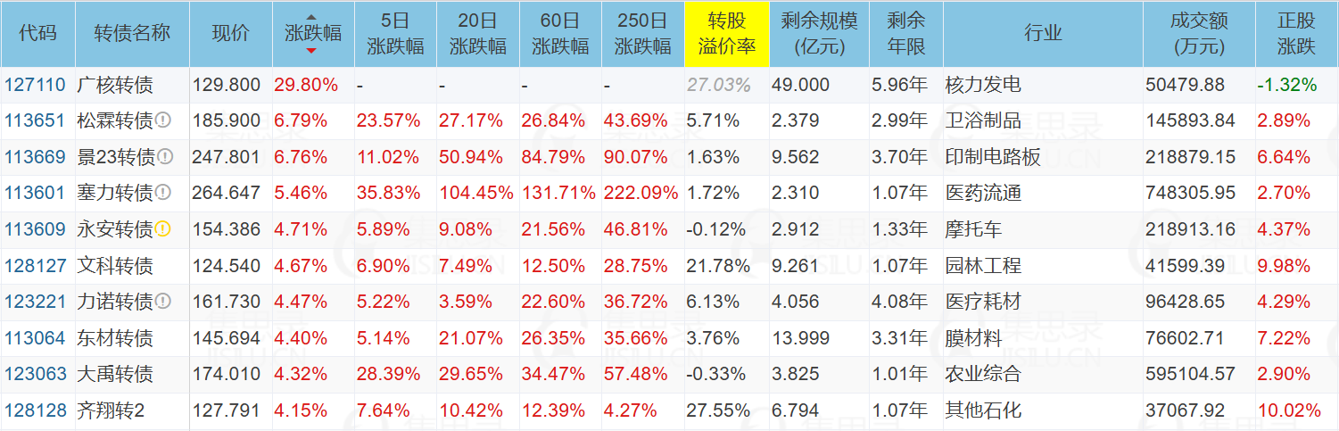 三羊马(-5.22%)、康泰医学(20.03%)、西藏天路(9.98%)、汇通集团(9.94%)、塞力医疗(2.70%)、苏博特(-10.01%)、广核转债(29.80%)