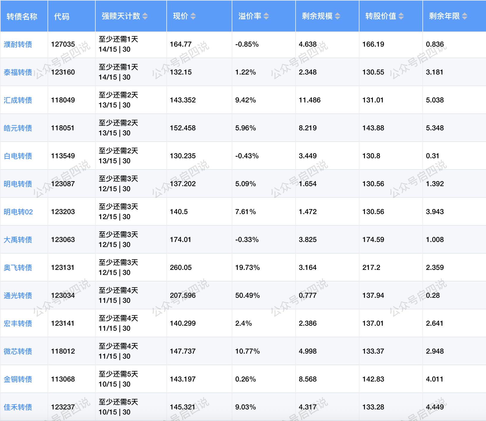 其中转股价值接近或大于130元,且规模大于3亿或溢价率大于3%的转债,需要注意强赎后杀溢价的风险。