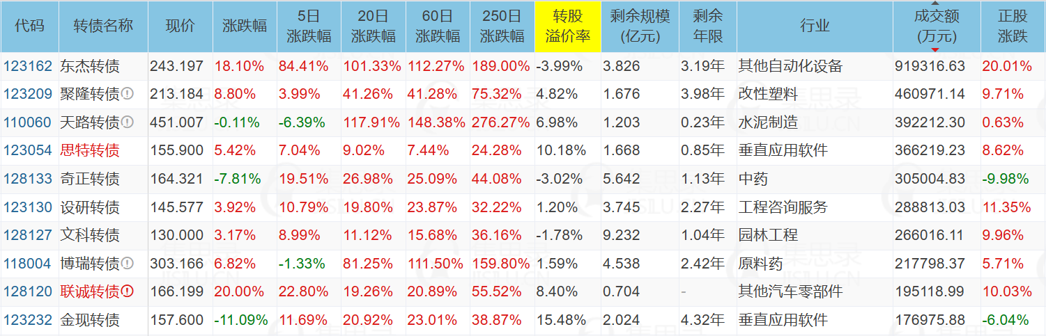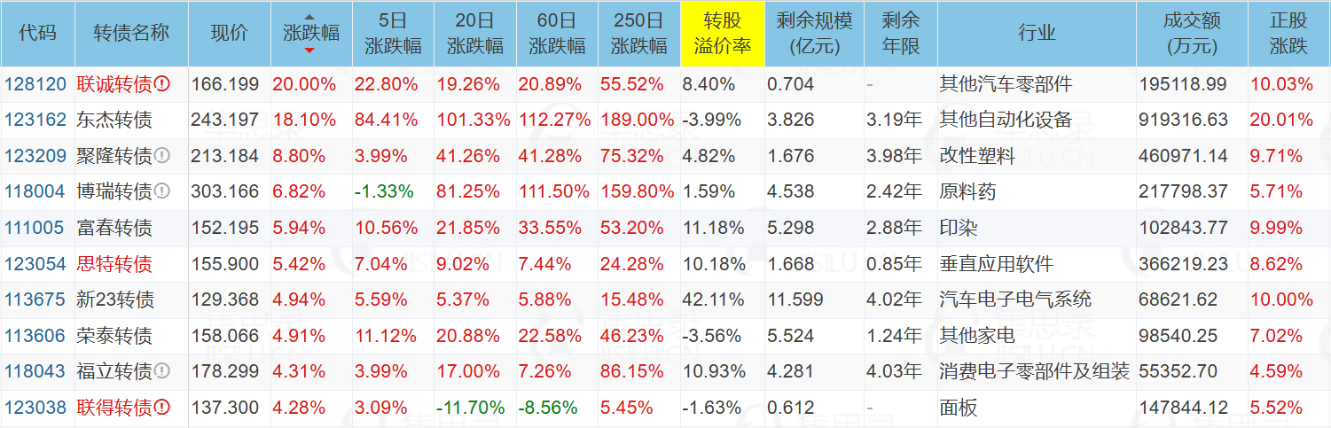 海亮股份(2.77%)、金现代(19.96%)、西藏天路(-4.01%)、东杰转债(20.00%)、金现转债(20.00%)
