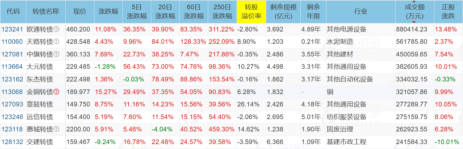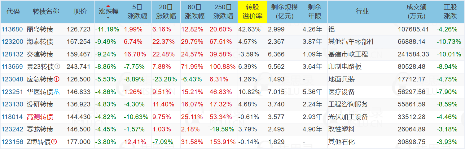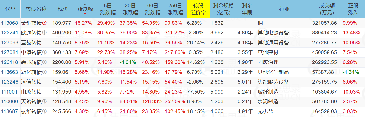 新疆交建(-10.01%)、金田股份(9.99%)、大元泵业(10.01%)、丽岛新材(-4.26%)、山东玻纤(10.03%)、金铜转债(15.27%)