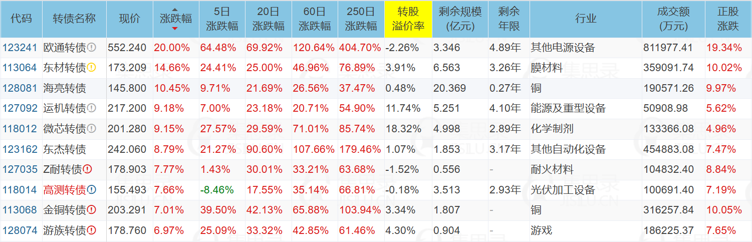 山东章鼓(10.04%)、欧陆通(19.34%)、金田股份(10.05%)、金田股份(10.05%)、再升科技(10.08%)、金铜转债(7.01%)、欧通转债(20.00%)
