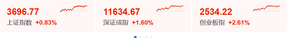 A股三大指数集体收涨,截至收盘,沪指涨0.83%,深成指涨1.60%,创业板指涨2.61%,北证50指数涨3.04%,沪深京三市全天成交额22728亿元,较上日缩量334亿元。全市场超4600只个股上涨。 板块题材上,PEEK材料、液冷服务器、PCB概念、证券板块走高,银行板块调整。