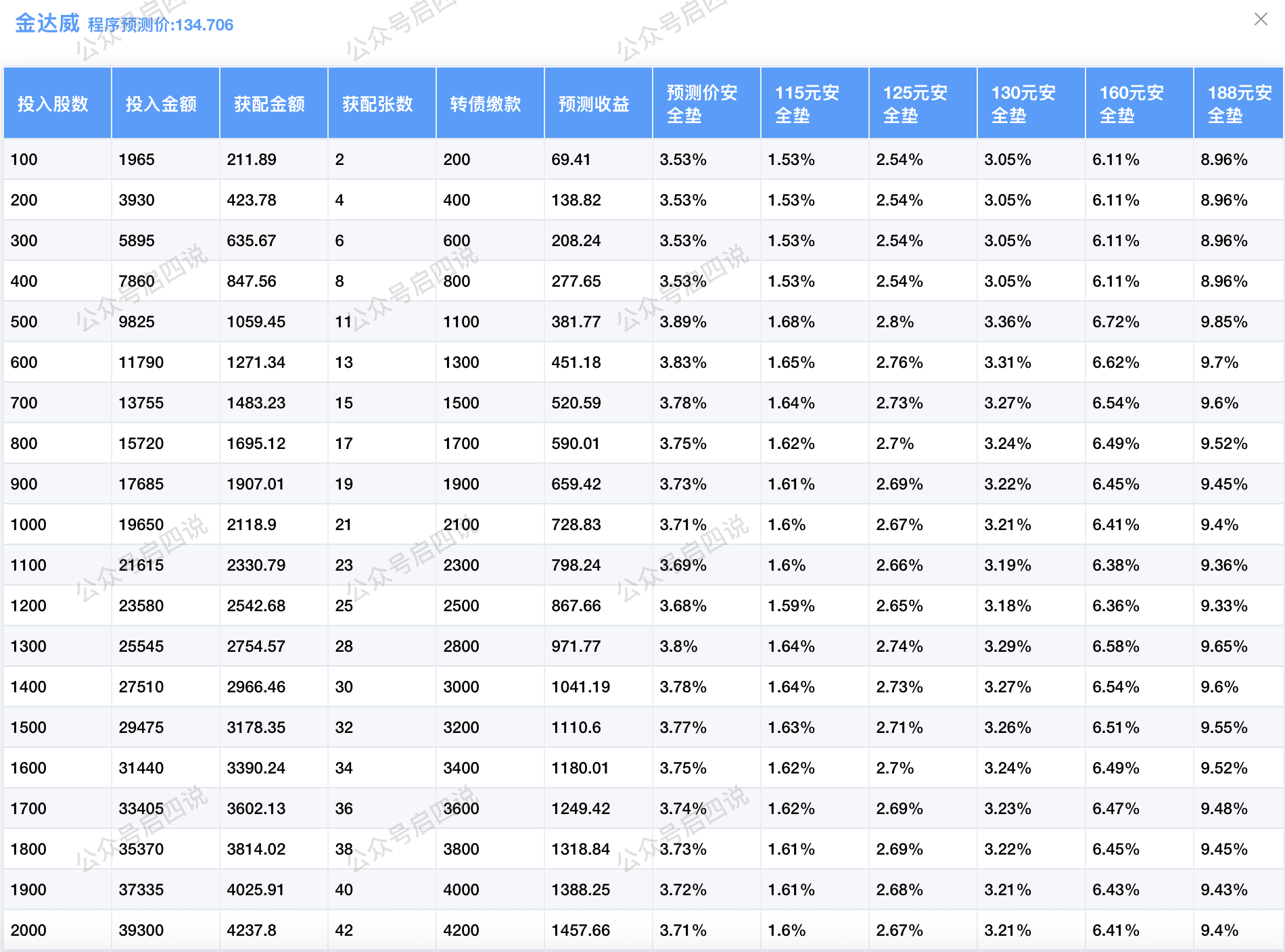 程序预测上市价134.706元,启四预估上市价在125-135左右,配债所需股数和安全垫可以参考下图: