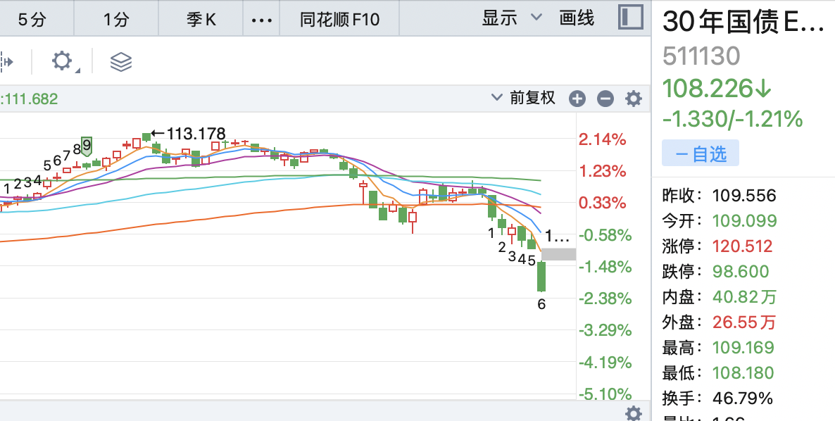 那钱哪来的?肉眼可见,债市在一直被抽血。今天长债恐慌得很,利率往上猛蹿,30年国债暴跌1.26%,从6月23日的最高点算起,已经回调了4.37%。这就是典型的跷跷板效应:股市吃饱,债市跌倒。