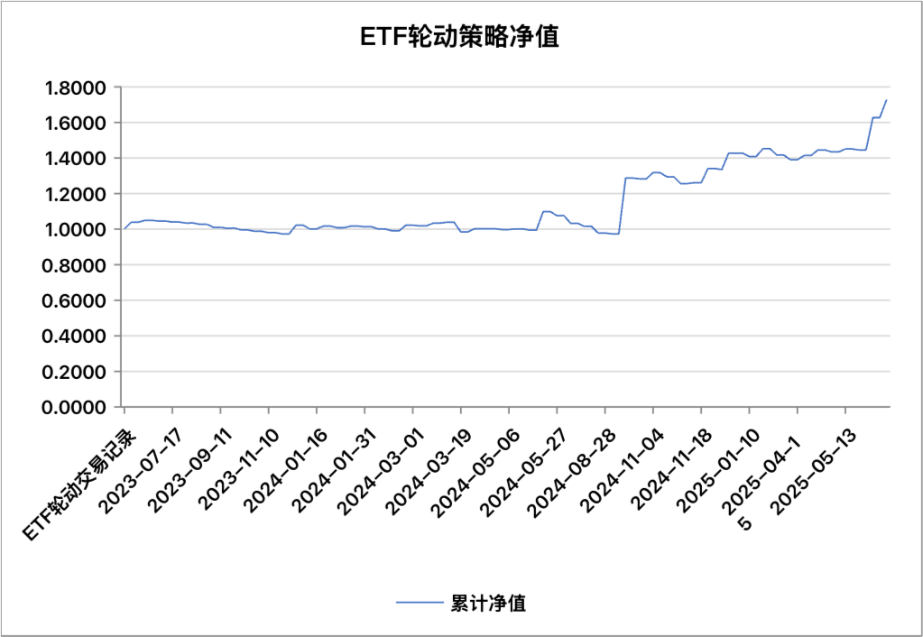 今天下午抽时间重新计算了ETF轮动的收益,之前是累加计算的,没有计算复利收益。用复利的方式重新计算后,从2023/6/12开始建仓,截至2025/08/12,总收益是72.85%,年化收益率约25.1%。
