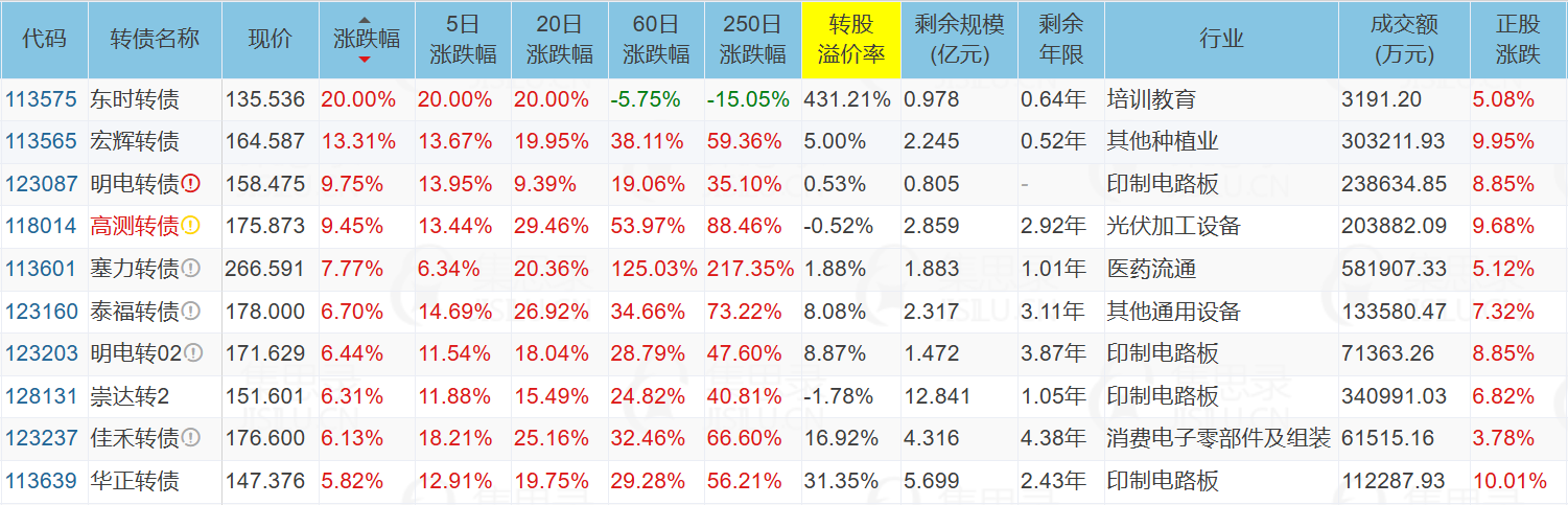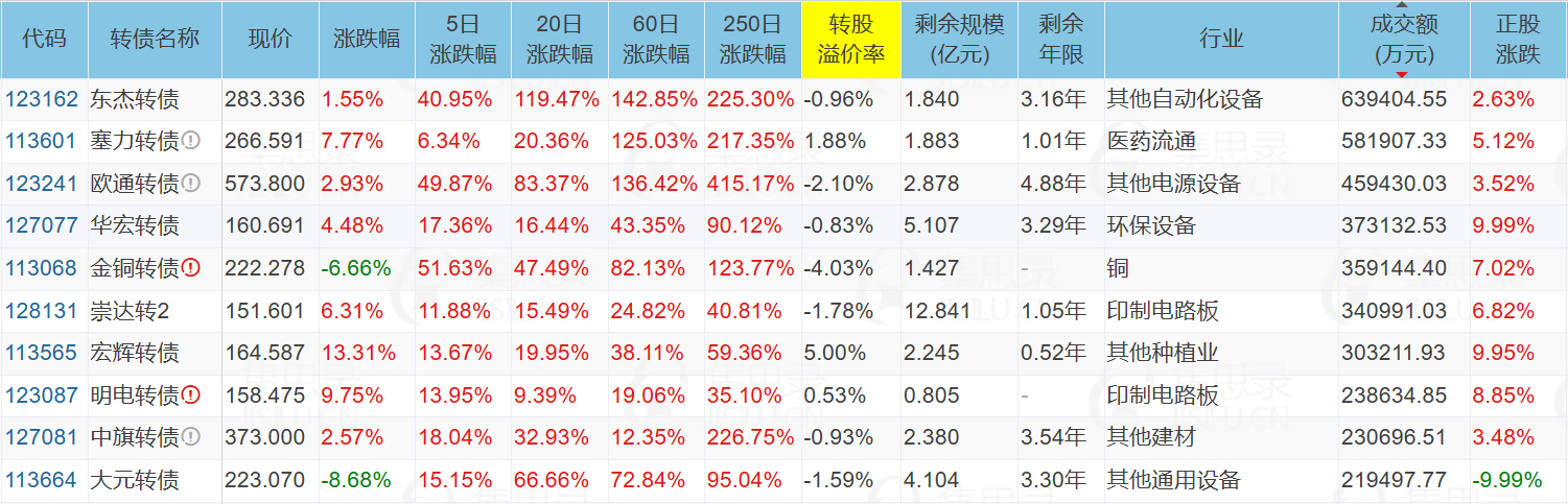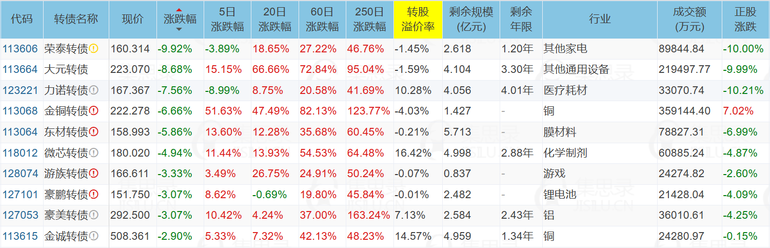 山东章鼓(5.00%)、领益智造(9.97%)、华宏科技(9.99%)、金田股份(7.02%)、金田股份(7.02%)、华正新材(10.01%)、荣泰健康(-10.00%)、大元泵业(-9.99%)、明新旭腾(9.99%)、东时转债(20.00%)